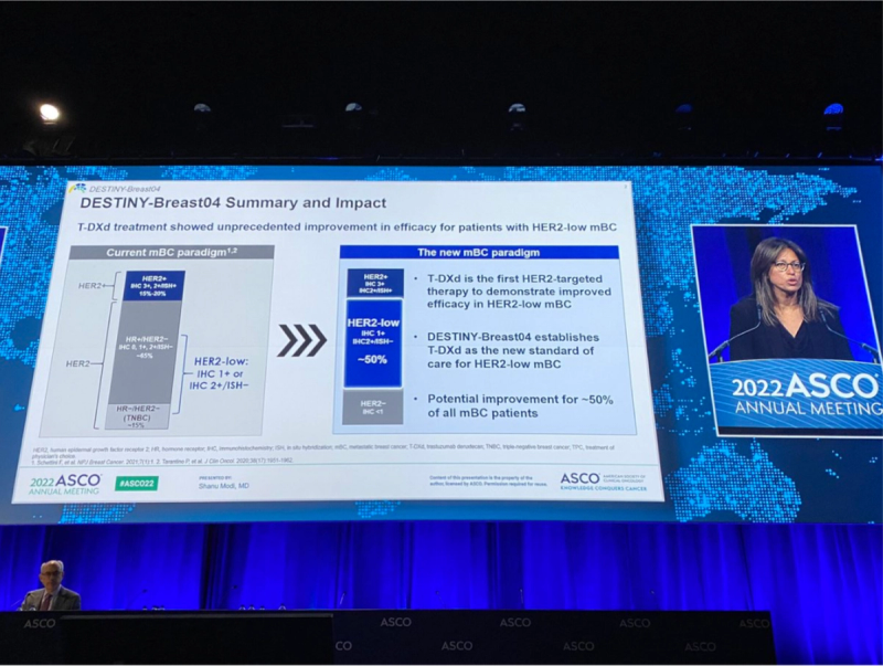 Then, on June 5th, 2022, history was made. Dr. Shanu Modi from MSKCC presented the phase 3 DESTINY-Breast04 trial, which revealed that trastuzumab deruxtecan (T-DXd) doubled progression-free survival (PFS) for patients with HER2-low metastatic breast cancer and significantly improved overall survival (OS), regardless of hormone receptor status, compared to standard chemotherapy.